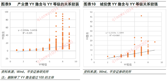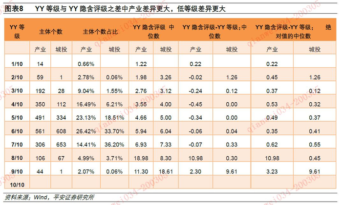 城投的YY隐含评级与YY等级之差小于产业,高等级的YY隐含评级与YY等级之差小于低等。YY隐含评级是带4位小数的,而YY等级仅包含1到10共10个数,理论上二者数值越大信用资质越差,而对二者进行对比可以挖掘被低估的个券,规避被高估的个券。从每一个YY等级的隐含评级中位数来看,大部分是和YY等级相匹配的。整体从中位数来看,城投的两个体系基本吻合,仅2/10和9/10偏离超过1;产业的偏离显著大于城投,但也仅是在8/10和9/10超过1;不过产业8/10等级和城投9/10的偏离都接近10,说明低等级的隐含评级与其YY等级差距明显偏大。