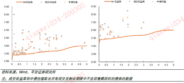 5) 对于普通债估值,如果同发行人有含权债活跃成交,需要关注中债估值可能会放大“期权价值”的影响。在计算二级成交价格对存量债券估值的影响时,中债不太区分成交债是否含权,如果刚好相同发行人有活跃成交的含权债,那么存续普通债的估值可能被“带偏”到接近含权债的水平,YY则优先考虑不含权债券的成交价格。