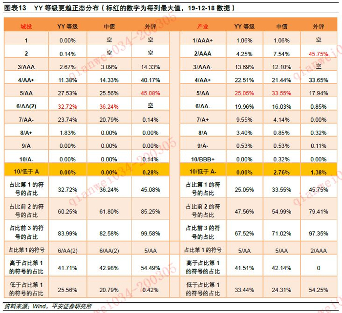 YY评级符号分布更趋正态,各符号的集中度相对更低。外部评级和中债隐含评级有20个左右的符号,YY等级仅10个符号。从占比最多的前三个符号的占比来看,YY的占比最低,外评最高。从高于占比最多的符号的占比和低于占比最多的符号占比来看,YY正态分布的特征更好。