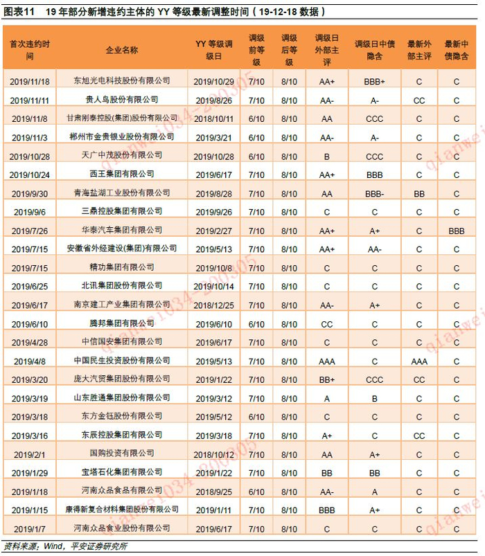 值得注意的YY等级在10/10档实际没有主体,违约主体主要归为8/10档和9/10档。城投中违约的呼和经开,目前被YY认定为城投,当前YY等级为7/10;中债未将其认定为城投,当前隐含评级为A-。除了呼和经开外,19年新增违约的主体多数也在19年发生过YY等级调整,调整后的等级均是8/10,其中不乏在违约后的调级,调级前YY等级多数是7/10,少部分是6/10。而产业主体中YY等级为9/10档的基本全是违约主体。对比来看,违约债的中债隐含评级基本是C,外部评级大多数也是C。