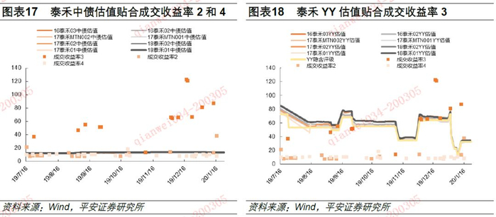 在计算二级成交价格对存量债券估值的影响时,中债不太区分成交债是否含权,YY则优先考虑不含权债券的成交价格。如前文所述在对泰禾债券进行估值时,中债更认可组4的价格信息,YY更认可组3的价格信息。而根据图表16,组4的成交天数更高,但成交量和换手率低于组3,因此单纯从数据量上来看组3和组4的价值相近,但组4在未来含有回售权,该期权的价值对债券价格会带来较大影响,因此我们认为整体看组3的价格信息更有价值。