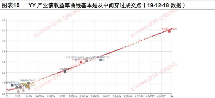 中债曲线从下方穿过成交点,各等级曲线比较规则;YY曲线从中间穿过成交点,但曲线形态可能因此而变得不规则。中债曲线各等级形态近似,但更贴近当日成交点的底部,这可能是因为中债对曲线形态的规定比较严格,挑选的样本券也往往属于所在评级较优质的个券。YY曲线会从当日成交点的中间穿过,但各等级曲线形态差异较大,这说明为了让曲线穿过成交点YY愿意牺牲一定的曲线形态。