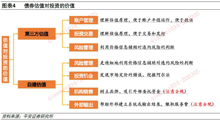 自建债券估值系统既能服务好自身投资又能对外输出,获取服务费或者吸引外部委托资金。机构只有形成自身对债券的定价才能挖掘阿尔法,另外风险管理方面直接用第三方估值系统比较粗糙,也面临信息安全等问题,因此自建债券估值对服务好机构自身投资有非常重大的意义。除了满足自身投资业务需要,也可以结合自营做市业务、资管业务、投资顾问业务等模式输出自身的研究成果,赚取服务费,树立品牌价值。不过向外输出研究成果可能会带来内外部的利益冲突,可能有一定监管风险。