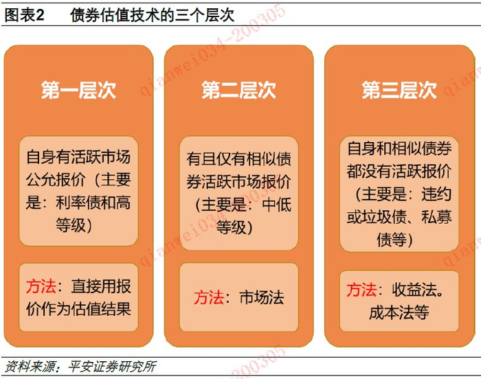 无论是公允价值内部估值还是第三方估值,债券公允价值估值都可以按照债券流动性的高低分为三个层次:流动性最好的利率型债券可以直接用报价作为公允价值(第一层次),中低等级信用债普遍需要用相似原理得到公允价值(第二层次),违约债等流动性最差的一类债券只能依靠清算价值等得到公允价值(第三层次)。第一层次的估值市场分歧较小,第三层次的估值应用范围较窄,而第二层次的估值是债券估值技术发挥作用的最主要领域。这类债券估值时要依靠相似原理,但判断债券相似可以依据价格信息也可以依据基本面信息,主要依靠前者的估值可以说是市场观点,主要依据后者的估值可以说是估值者的观点。