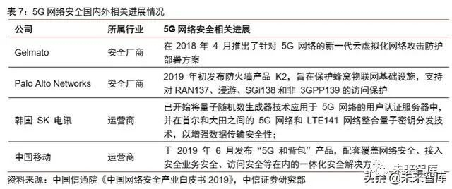 应用方面,5G 安全的落地是赋能 5G 应用的关键。相比于传统行业应用,安全为成 本单位起到保障作用,对于 5G 垂直行业大的应用场景而言,5G 安全为赋能作用,安全性 达标为应用场景兴起的必然过程。大场景通常与大安全所对应,安全要求有时较场景需求 更为重要。如 5G+自动驾驶领域,低时延、大容量、大连接的特性满足自动驾驶的性能要 求,而 5G 网络、车载设备的安全性和稳定性则是实现自动驾驶的基础要求,相较于 5G 性能上产生的一次性提升,应用安全则是应用落地所需进行的长期提升于保障;如 5G+医疗领域,具有远程会诊、医疗影像、急救车载等 5G 相关的巨大的应用场景,与之对应, 鉴于医疗行业的特殊性,其对泛医疗终端设备的稳定性、隐私医疗数据的保密性、终端与 数据中心间传输的可靠性等要求往往更高。因此,我们认为,5G 安全赋能对推动 5G 应用 发展具有基础性的作用。