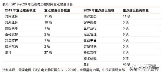 国网稳步推进泛在电力物联网,2020 年为第一阶段的关键建设期。2019 年国网出台 多项政策,稳步推进泛在电力物联网建设,2019 年 12 月发布的《泛在电力物联网 2020 年重点建设任务大纲》,指出 2020 年将是泛在电力物联网建设“三年攻坚”的突破年,国网 2020 年 1 号文件《国家电网有限公司关于全面深化改革奋力攻坚突破的意见》提出了六 个方面的重点任务,创新“两网融合”业务发展体系位列第一。从建设任务数量上看,2019 年共计 6 个方向 27 项重点建设任务,2020 年,对建设领域重新进行了细化,共设计 8 个 方向 40 项重点建设任务。此外,由泛在带动的新兴能源互联网业务将面临具体的创收指 标, 《泛在电力物联网建设总体方案》指出,2020-2021 年,重点完成试点示范推广建设, 智慧物联体系建设初步完成,新兴能源互联网业务收入超 500 亿。