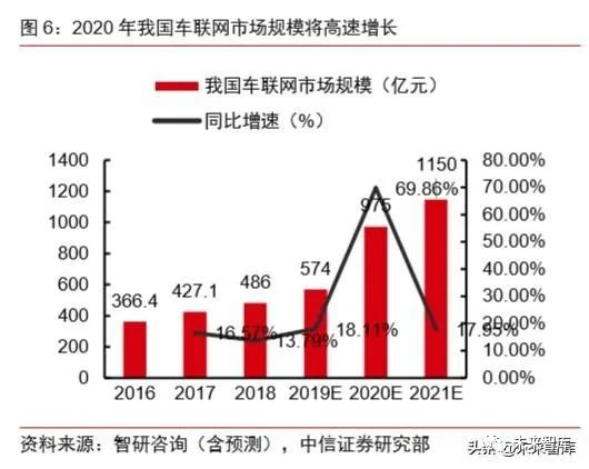 国内车联网市场巨大,未来车联网市场规模有望进一步高速增长。智研咨询数据显示, 2015 年全球车联网渗透率为 10%,我国渗透率为 7%,而预计到 2020 年,全球和我国车 联网渗透率将分别超过 20%和 24%,我国车联网渗透率将超过全球平均水平。而从车联 网市场规模维度来看,2016 年我国车联网市场规模 366.4 亿元,2018 年上升至 486 亿元, 增速稳定在 14%左右。到 2020 年,随着 5G 技术的推广应用、V2X 的技术发展以及用户 消费水平的进一步提高,我国车联网市场规模进一步高速增长。