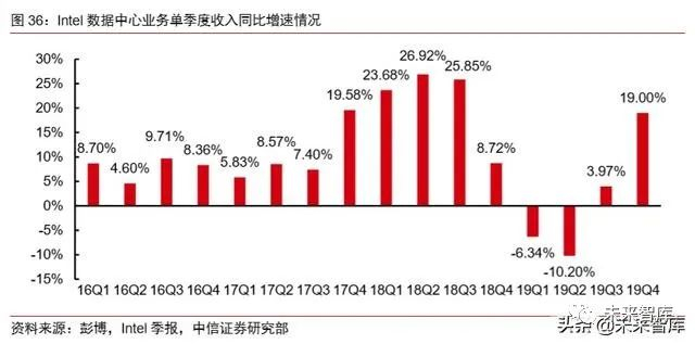 上游供给端,英特尔数据中心业务 Q4 大幅超预期。芯片厂商 Intel 数据中心业务于 2019 年第三季度实现 28%的环比增速,同比增长 3.97%,重回增长通道。2019 年第四季 度,Intel 数据中心业务同比增速大幅提升至 19%,远超公司此前给出的 5%的指引,大幅 超出市场预期。服务器行业在供给端及需求端的双向拉动下有望显现拐点向上趋势。