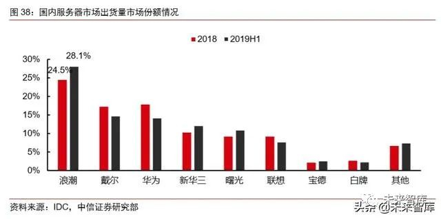 强者更强, JDM 模式把握核心客户,规模效应有望显现。浪潮为国内服务器行业龙头, 据IDC数据, 2018年浪潮服务器出货量市场份额达 24.5%, 2019年上半年份额达28.1%。区别于传统 OEM、ODM 模式,浪潮采用 JDM 模式,面向应用,融合产业链,与客户建 立的联合定制开发与合作的模式。JDM 模式助力公司深度理解客户需求并实现快速响应, 具有较高的研发及量产效率。此外,公司承担了较大的研发费用,为客户提供了高质的产品和较低的成本,客户粘性强,兼具品牌优势和白牌优势。目前,行业整体利润率较低,利于挤压长尾厂商市场空间,高成本产能有望加速出清,服务器市场集中度有望进一步提 升,公司作为业内龙头,未来规模效应有望显现。