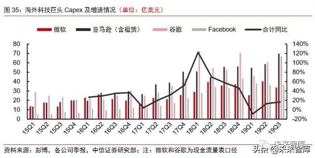下游需求端,北美科技巨头 Capex 持续回升。北美科技巨头 Capex 于 2019 年 Q2 实现回升,并于 Q3 呈加速回升态势。2019 年二季度,微软、亚马逊、谷歌、Facebook 等 4 家海外科技巨头 Capex 总额同比提升 12.9%,较一季度-8.9%的增速有大幅回升,三 季度同比增速提升至 16.7%。