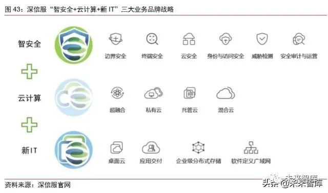 战略升级,“智安全+云计算+新 IT”协同共迎接 5G 云网融合。信息安全为公司传统 优势业务,公司多项产品市占率保持在 10%左右的较高水平。2016 年,公司正式发布了 企业级安全和云计算两大子品牌“智安全”和“云 IT”,实现了业务战略的第一次大升级。2019 年,公司对自身业务架构进行了进一步的升级,发布了“智安全+云计算+新 IT”的 三大业务品牌战略。在 5G 云网融合的趋势下,公司各项业务的协同,将为公司建立在 5G 云网两端的行业联动优势。