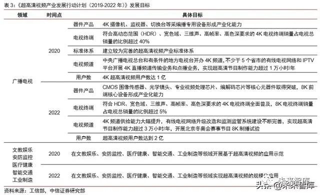 政策力推超高清,产业规模将达 4 万亿。2019 年 2 月 28 日,工业和信息化部、国家 广播电视总局、中央广播电视总台等三部门联合印发了《超高清视频产业发展行动计划 (2019-2022 年)》(简称“超高清行动计划”) ,引导视频产业向 4K、8K 的升级转换,计 划指出,到 2022 年,我国超高清视频产业总体规模超过 4 万亿元,4K 产业生态体系基本 完善,8K 关键技术产品研发和产业化取得突破。