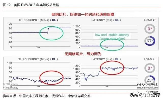 随着 5G 基数设施的渗透率提升,C-V2X 有望无缝对接,在低时延、高带宽、海量连 接的属性下,进一步升级 V2X 服务体验。5G 的网络切片可提供始终如一的低时延和高速 率服务保障,这对于安全性要求极高的自动驾驶领域尤为关键。从下图的实际测量数据看, 我们能看到在网络切片的保障下,信号的传输速率和时延基本能够保持稳定,而无网络切 片下,时延现象非常明显,且数据传输并不稳定。