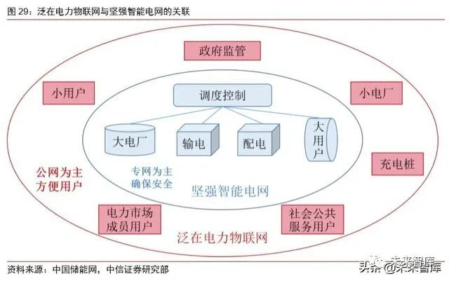 增加连接数为泛在电力物联网与坚强智能电网的最直接区别。泛在电力物联网和坚强智能电网共同组成了国网的“两网”,坚强智能电网。两网最直接的区别为数据接入范围 和数据安全保障的跷板平衡。坚强智能电网,主要针对电力核心数据,数据安全性较重要,以专网为主确保安全,数据连接量相对较少;泛在电力物联网,主要针对泛电力圈的数,泛电力圈的数据获取及分析使用,以公网为主方便用户,数据连接数较多,安全性要求相 对较低。因此,对于泛在电力物联网,最表观的变化是连接数的大量增加。