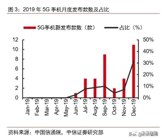 (3)5G 手机:2019 年下半年起,5G 手机逐步发布,新发布款数及月销量总体呈迅 速上升态势,中国信通院数据指出,2019 年 12 月,5G 手机国内出货量已达 541.4 万部, 占比达 17.8%,新上市 11 款,占比达 31.4%,截至 2019 年底,国内市场 5G 手机出货量 超过 1377 万部。未来 5G 终端推广将继续加速,5G 手机快速覆盖,并将有望带动国内智 能手机出货量 2020 年增长率回归增长。据 IDC 预测,在未来短期内,国内 5G 终端出货 数量将会领先 5G 网络用户数,至 2021 年,20%的商用手机将通过 5G 连接。