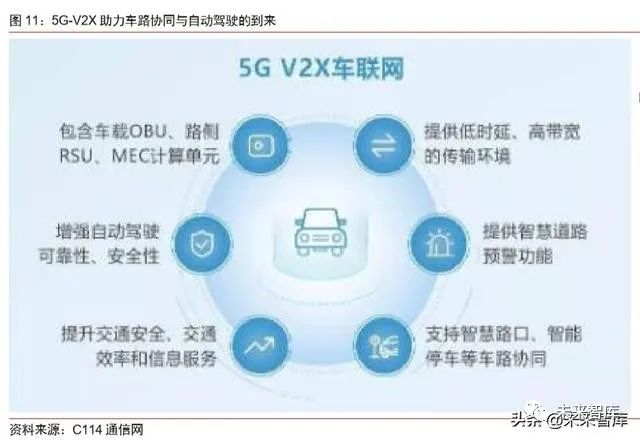 车联网是 5G 技术的核心领域,广泛受益 5G 各项特性。我们在此主要选择车联网行 业对 5G 低时延进行剖析和梳理。5G 技术的核心优势在于低时延、高带宽、海量连接。对 应地,低时延使得汽车的数据和信息可以快速交互,高带宽使得车联网信息的传输具备更大的容量,同时可以保证传输速度,海量连接指单车可接入的连接数更高,车辆与周边设 施进行高可靠的配合,实现车路协同。我们认为,5G 的优势可以在车联网上得到较好的 体现,车联网将是 5G 的核心受益者,未来发展具备较强的确定性。