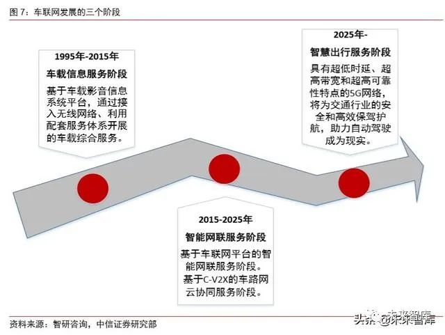 长期看,5G 助力车联网由智能网联向智慧出行服务阶段演进。车辆网发展可分为三 个阶段,第一阶段以车企为主导,包括影音等功能性车载信息服务;第二阶段是智能网联 服务阶段,包括基于车联网平台的智能网联服务和基于 C-V2X 的车路网云协同服务阶段;第三阶段是智慧出行服务阶段,自动驾驶将全面落地。现在正处于智能网联服务阶段,以 LTE-V2X 为代表的 C-V2X 技术快速演化,5G 助力推动下,未来 L4 级别以上的智能驾驶 有望实现。