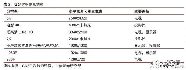 超高清视频是 5G 大容量所对应的代表性产业,分辨率较上代呈幂级增加,色域、色 深、帧率等指标均有大幅提升。分辨率上,1080P 向 2K 仅是小幅提升,2K 向 4K 则是大 幅跃进。从分辨率上看, 1080P 为美国电影电视工程师协会 SMPTE 所制定的标准, 而 2K、 4K 为数字电影联盟 DCI 所制定的标准,1080P 是指垂直像素为 1080,其分辨率大小为 1920x1080,而 2K 是指水平像素为 2048,垂直像素未指定,通常为 2048x1080,1080P 与 2K 的总像素相差并不大。而超高清(UHD)像素为 3840x2160,4K 像素通常为 4096x2160,相较于 2K,超高清和 4K 在总像素上提升近 4 倍。更甚者,2K 向 4K、4K 向 8K 的演进在总像素上呈现为幂级的非线性加速增长,使得视频大小大幅提升,对网络带宽的要求将加速提升。除分辨率外,超高清视频在色域、色深、帧率等指标上亦有较大 的提升要求,将带来额外的视频处理和转换工作。5G 大容量特性对传输条线的支撑,将 对超高清 4K 的普及起到重要的催化作用。超高清的实现需要产业链各个环节均满足超高 清的技术要求,并且,超高清视频容量提升对产业链相关设备的要求提升效果类似摩尔定律。我们认为,产业链内支持超高清的设备及器件在量价等两个维度较上代均有望加速提 升。