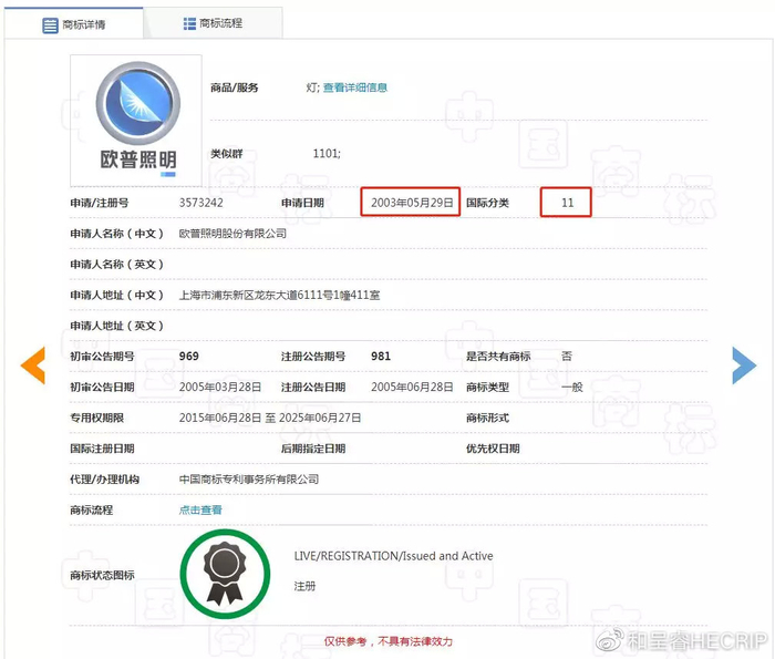 第3573242号“欧普照明及图”注册商标核定使用在第11类的灯、冰箱、电加热装置等商品上。