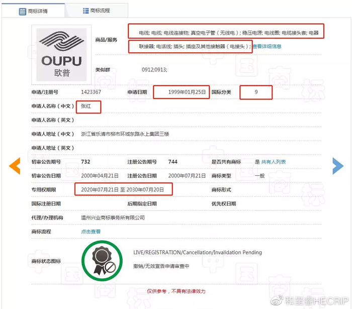 第1423367号“欧普OUPU及图”注册商标的申请日期为1999年1月25日,注册公告日为2000年7月21日,申请人为张红,核定使用在第9类“电线、电缆、电线连接物、真空电子管(无线电)等商品上,注册有效期续展至2030年7月20日。