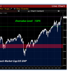 截止 2019 年四季度伯克希尔·哈撒韦公司持有 1279 亿美元,从巴菲特惯用的指标: 美股总市值/美国 GNP 比值来衡量,该指标创出 40 年来最高水平,这意味着现在美股整体估值的昂贵程度已经超过了 2000 年互联网泡沫时期,远远高于巴菲特认为可以入市的水平。