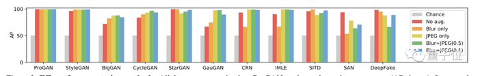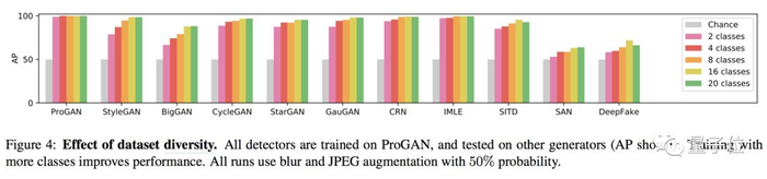 在多个不同的CNN模型生成的图片集里,ProGAN训练出的分类器都得到了不错的泛化: