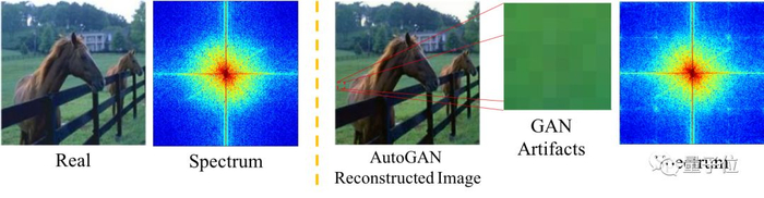 比如同样是一张马的图片,真实照片的信号主要集中在中心区域,而GAN生成的图像,频谱图上出现了四个小点。