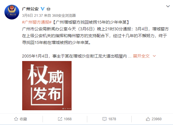 广州市公安局新闻办昨晚(6日)通报:3月4日,警方经十几年的不懈努力,终于寻找回15年前在增城被拐的少年申某。目前警方已邀请心理专家对申某本人及相关人员进行心理疏导,将按照疫情防控相关规定,在确保安全的情况下组织认亲工作。
