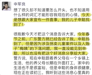 2020年3月5日,申聪父亲申军良告诉记者,在春节前,已收到广州警方的通知,“孩子可能找到了”。5日下午,申军良被通知来广东认亲。