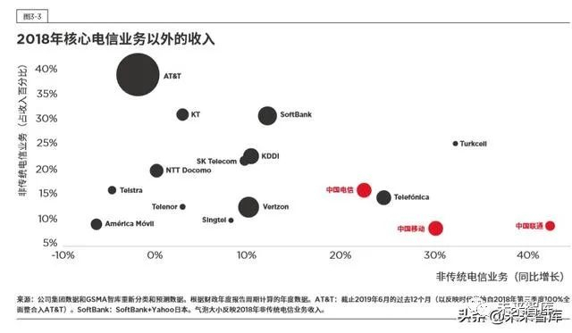 对于全球大部分主要运营商而言,核心移动业务和固 定业务占收入的80~90%,而非传统电信业务占收入 的10~20%。也存在一些例外情况,例如AT&T、韩国 电信和日本软银SoftBank(非传统电信业务的收入占 比分别约为40%、30%),其非传统电信业务收入源 于并购而非来自有机增长。