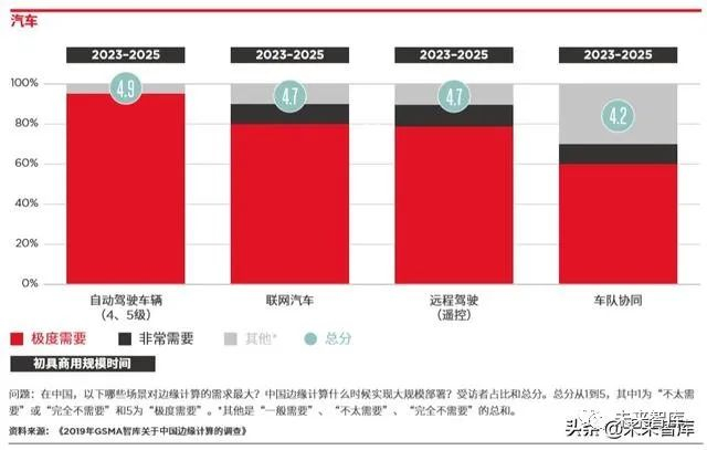 • 受访公司反映,真正的自动驾驶汽车对边缘计算 的需求最大。然而,要达到4级或5级自动驾驶, 需要进一步完善立法层面和提高车辆技术,并大 量投资道路基础设施建设,因此预计在中国,自 动驾驶相关的边缘计算会于2023~2025年才开始初 具商用规模。
