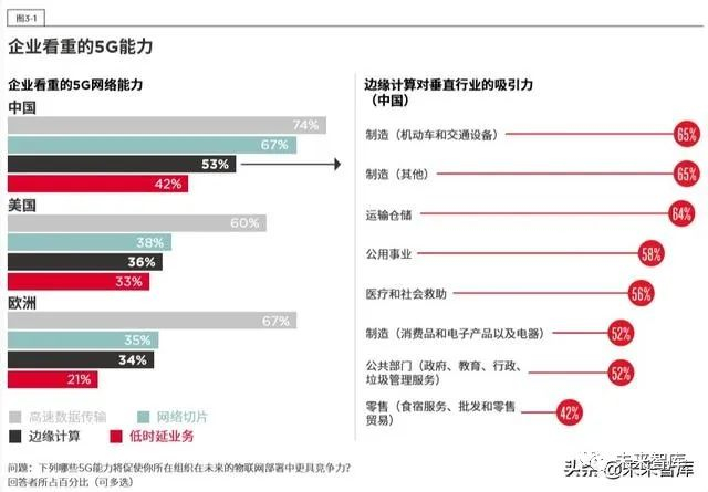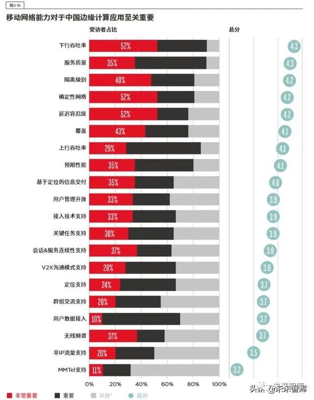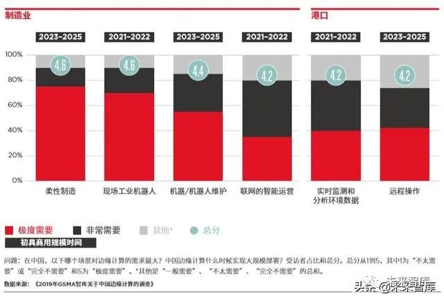 许多受访公司表示,针对智能工厂、智慧港口和智慧 园区等,应就近部署边缘技术以支撑关键应用,为其 提供超低时延、实时处理分析、安全可靠网络等一 体的最优运行环境。如果需要覆盖更广范围的应用场 景,包括智慧城市、自动驾驶、云/边缘沉浸式游戏 以及通过移动终端接入和使用的其他服务,那么以区 或市为颗粒度来部署边缘基础设施将更加经济有效, 在这些场景下,中国运营商通过快速部署5G并结合网 络切片技术,可以提供所需的网络能力。