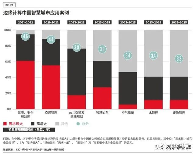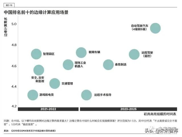 • 第二波(2021~2023年):初具商用规模。随着中 国运营商大规模部署5G网络(GSMA智库预测,截 止2023年底5G网络将覆盖中国60%的人口),自 动驾驶、体育赛事和游戏等边缘计算应用也将进 行更多探索,边缘基础设施部署在基站汇聚点附 近、区县/市区、区域数据中心。
