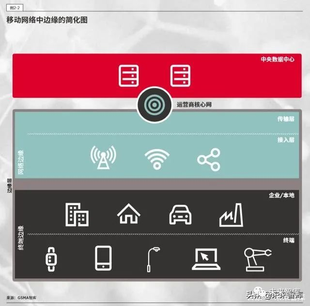 与完全基于云的传统模式相比,边缘系统架构将存 储、计算、处理和组网等云功能推近生成或使用数据 的设备。对于移动网络来说,“接近”是一个相对概 念,它可以是比较近的位置(即在传输网中),也可 以是客户所处的位置(无论在用户设备内部还是在用 户驻地)。图2-2为移动网络中边缘的简化图。