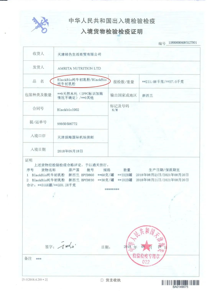 在 BlackBioG20 免疫活性蛋白的入境检疫证明中,品名那一栏清清楚楚、明明白白地写着「纯牛初乳粉」。