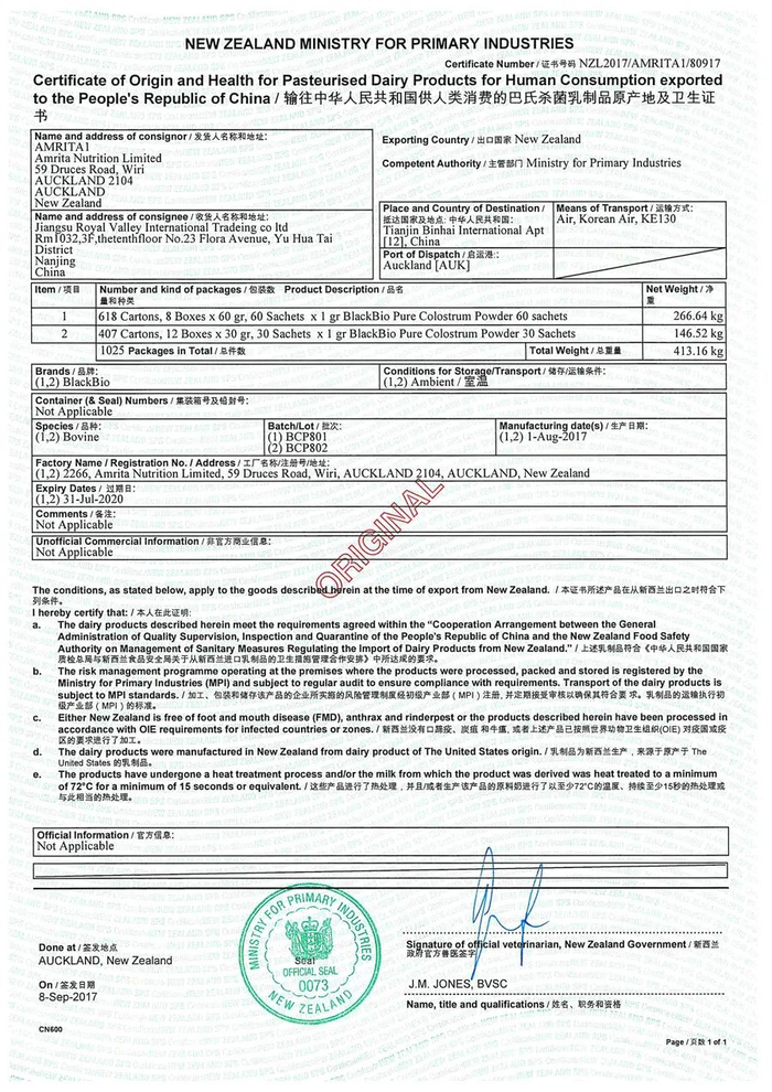 作为 100% 的新西兰原装进口品牌牛初乳,BlackBioG20 免疫活性蛋白拥有新西兰原产地证明及卫生证。