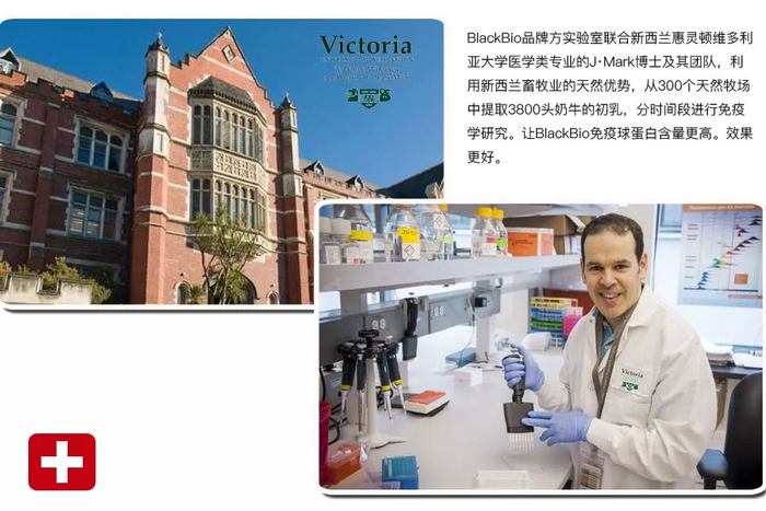 牛初乳经过 BlackBio 品牌方实验室、和新西兰百年医学院校惠灵顿维多利亚大学的 J·Mark 博士及其团队的共同筛选和检测,以制药级别严格把控初乳品质。