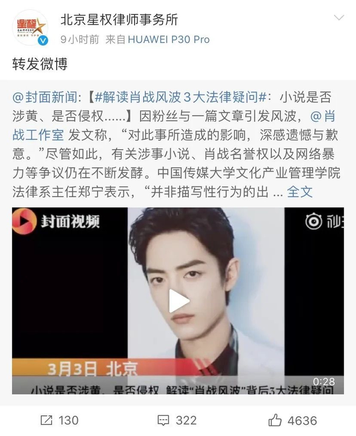 3月7日凌晨,北京星权律师事务所转发内容为“肖战风波3大法律疑问”的微博,疑似将为肖战受理名誉官司