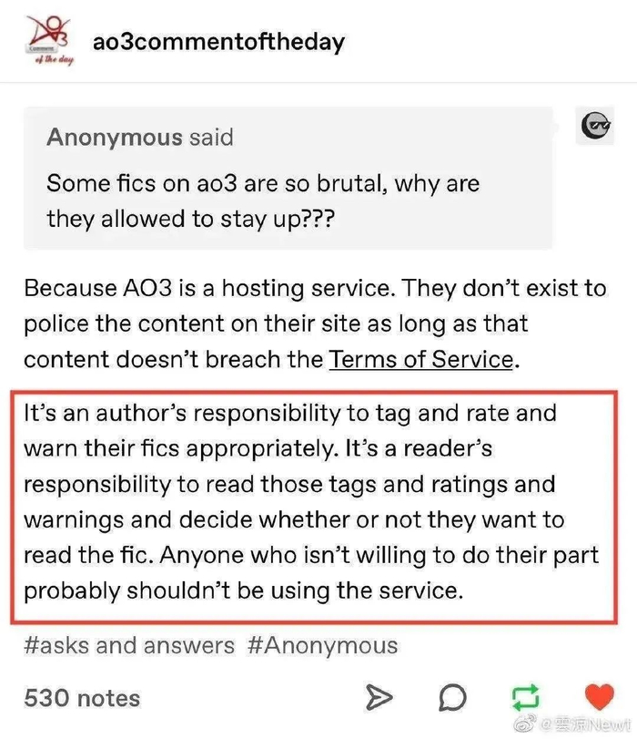 AO3网站对网站创作者的职责要求:“作者的职责是标明警告标签,读者的职责是阅读这些警告并作出判断。如果做不到以上两点,你就不应该使用AO3的服务。 ”