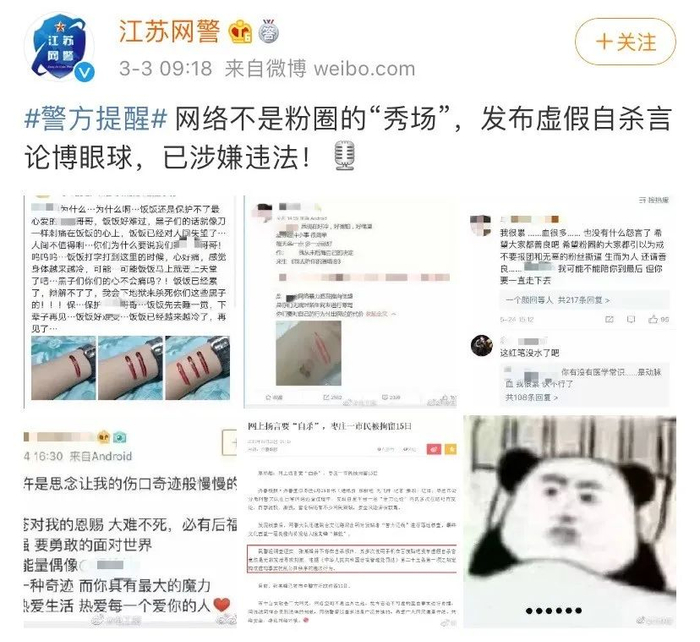 “227事件”后,部分肖战粉丝发博称“自杀退圈”。后江苏网警表示“发布虚假自杀言论博眼球,已涉嫌违法”