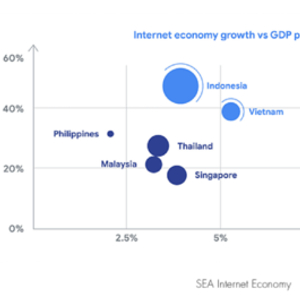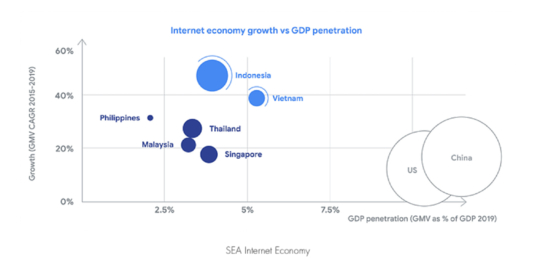 东南亚地区的科技行业与美国、中国相比还有巨大的发展空间。 在2018年,东南亚地区互联网经济价值仅 1000亿美元(不到 GDP 的3%)。 同年美国互联网经济价值1.5万亿美元(占 GDP 的8%),中国互联网经济价值8540亿美元(占 GDP 的7%)。独角兽数量同理,东南亚地区仅有11 家独角兽企业,只占全球447家独角兽企业的2.5%。相比较而言,美国有206家独角兽企业,中国有109家。