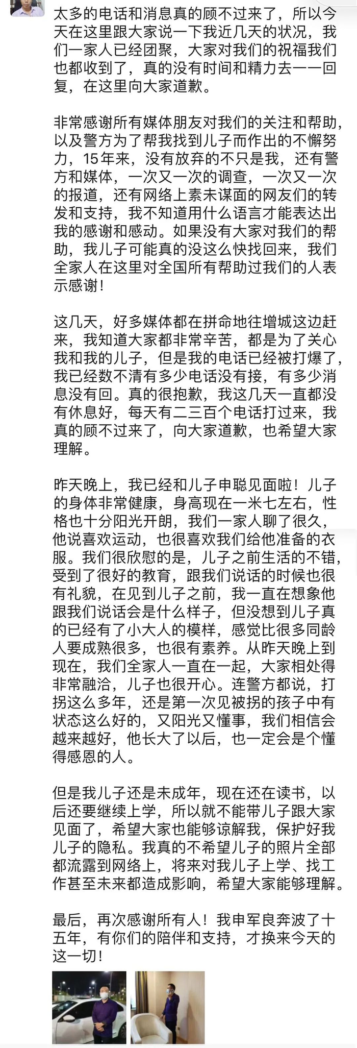 所有人都在寻找他,但都没有得到回应。3月8日下午四点半,他更新了朋友圈:“我已经和儿子申聪见面啦!儿子的身体非常健康,身高现在一米七左右,性格也十分阳光开朗,我们一家人聊了很久,他说喜欢运动,也很喜欢我们给他准备的衣服。”