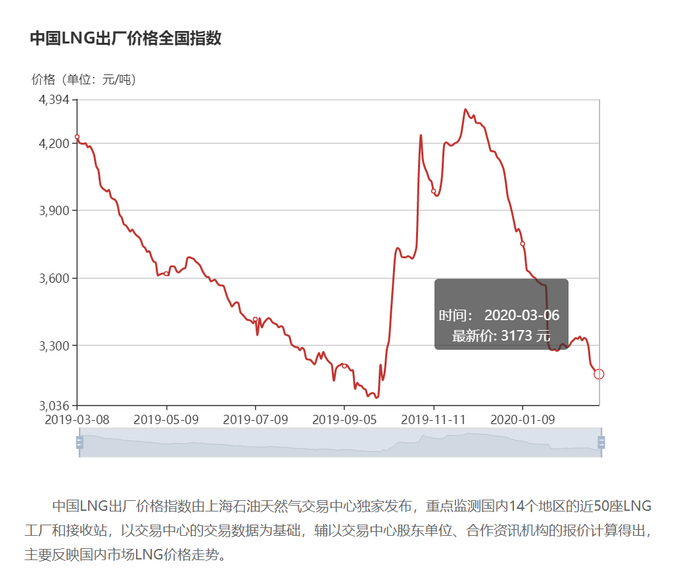 近10天内,我国天然气价格又有一波急剧下滑。上海石油天然气交易中心发布的中国LNG出厂价格指数显示,2020年以来,全国LNG价格从约4000元/吨下滑至3月6日的3173元/吨,下滑幅度约为30%。尤其是从2月27日开始,急剧下滑。
