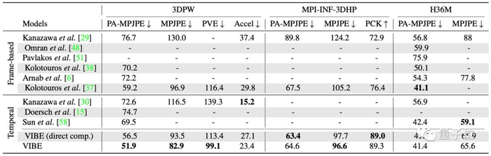 研究人员在这个三个数据集上,将VIBE和其他最先进的,基于帧和时间的模型做了性能比较。