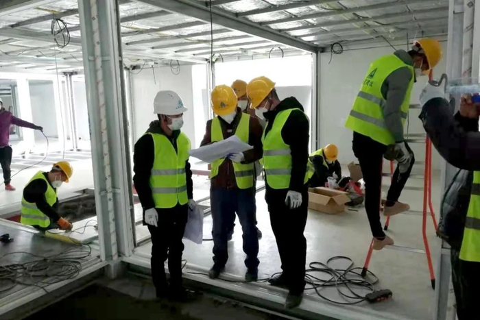 2月2日,集团又调集40余人,奔赴雷神山医院,负责医院病区A、B、C单元集装箱过道底板的铺装及隔墙墙板的安装。
