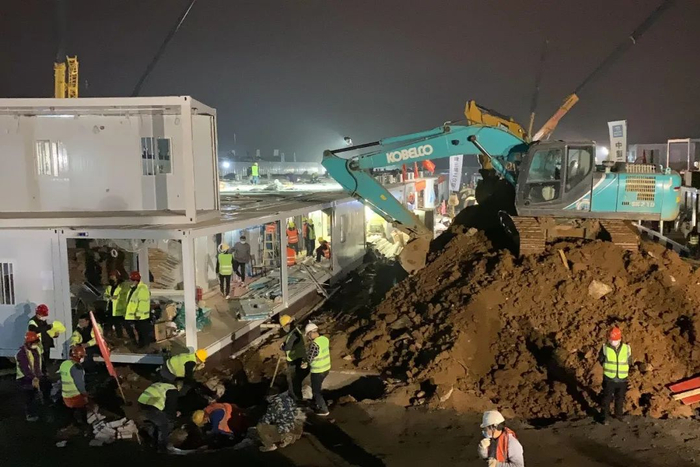 山河集团一边是联系电力、通信、天然气、水务等部门,确保通电、通网、通气、通水;一边是快速调配物资,协调分包单位,全力推进工程进度。无论外面大雪纷飞还是风冷雨骤,大家一刻也不敢停歇。