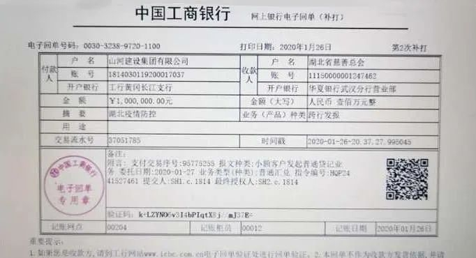 1月26日,山河集团通过湖北省慈善总会捐赠100万元爱心款,全力支持黄冈地区的疫情防控工作。
