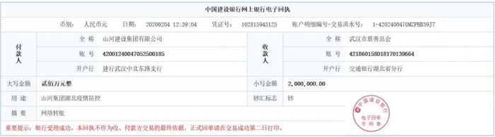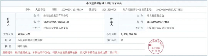 2月4日,山河集团再次捐赠400万元,其中向武汉市慈善总会捐赠200万元,向湖北省慈善总会捐赠200万元,助力一线医护人员顽强应战。
