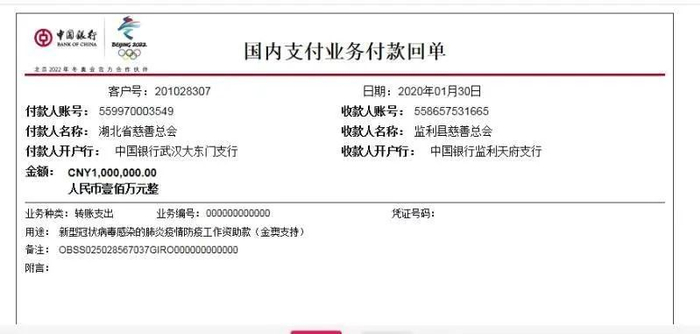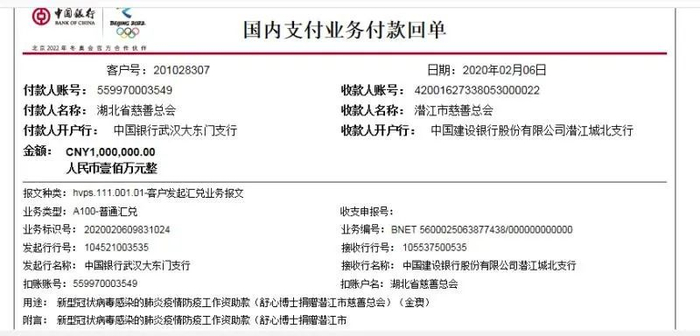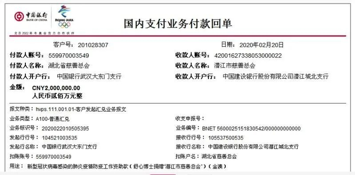 ——2月20日,再次向潜江市慈善总会追加捐款200万元。