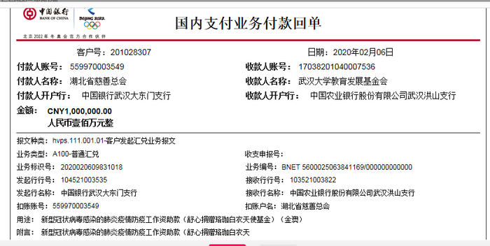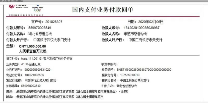 ——2月5日,向潜江市、孝感市慈善总会和武汉大学珞珈白衣天使基金捐款300万元。